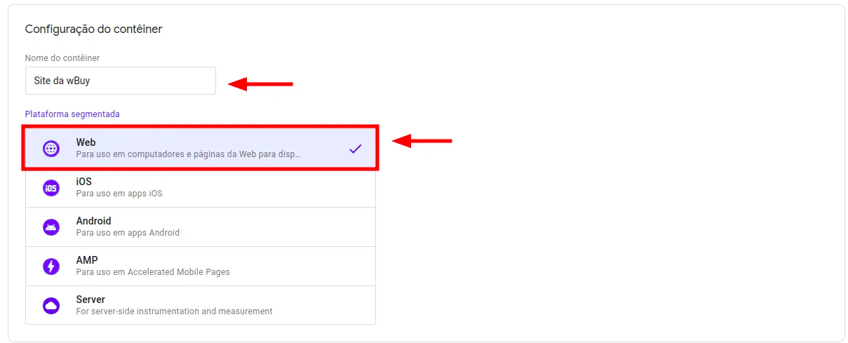 Em primeiro lugar, acesse o painel do GTM clicando aqui, clique em Adicionar conta e preencha os dados. Na seção seguinte você ira criar seu contêiner, configurando o nome dele. Na Plataforma Segmentada, selecione “Web”.