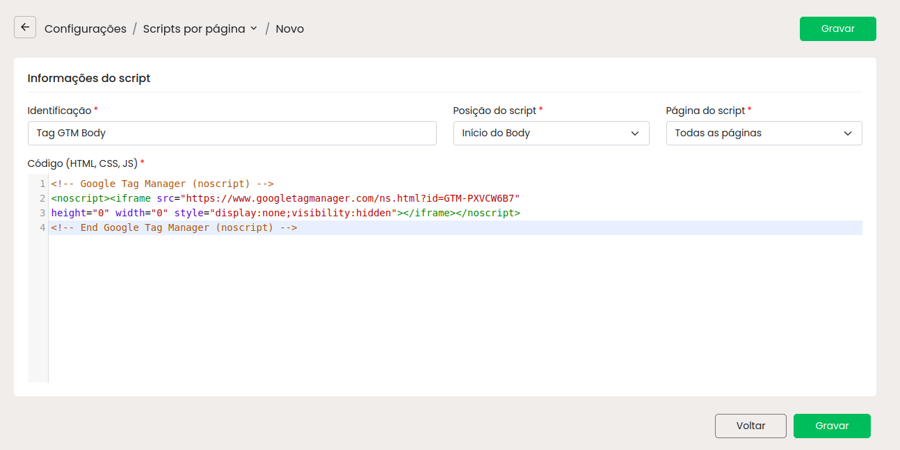Clique em Gravar e pronto! Suas tags do GTM estão instaladas na sua loja.