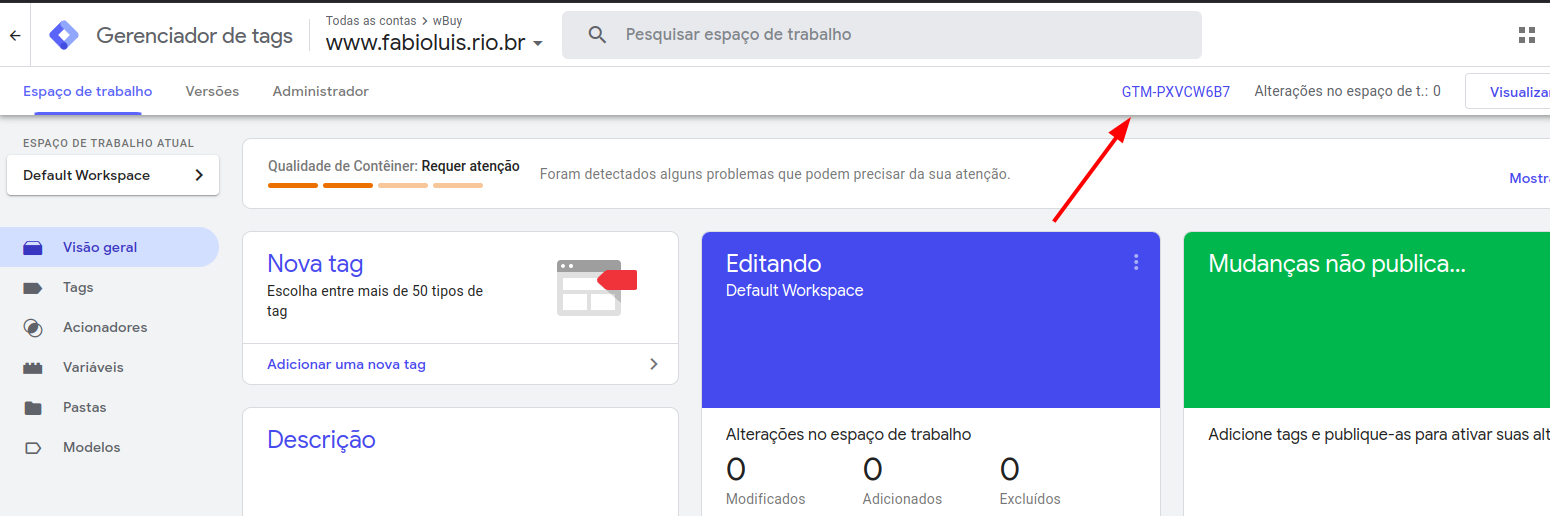 Caso você já possua uma conta do GTM, na página inicial aparecerá o id da sua conta, logo no topo. Clique sobre ele e serão mostradas as tags
