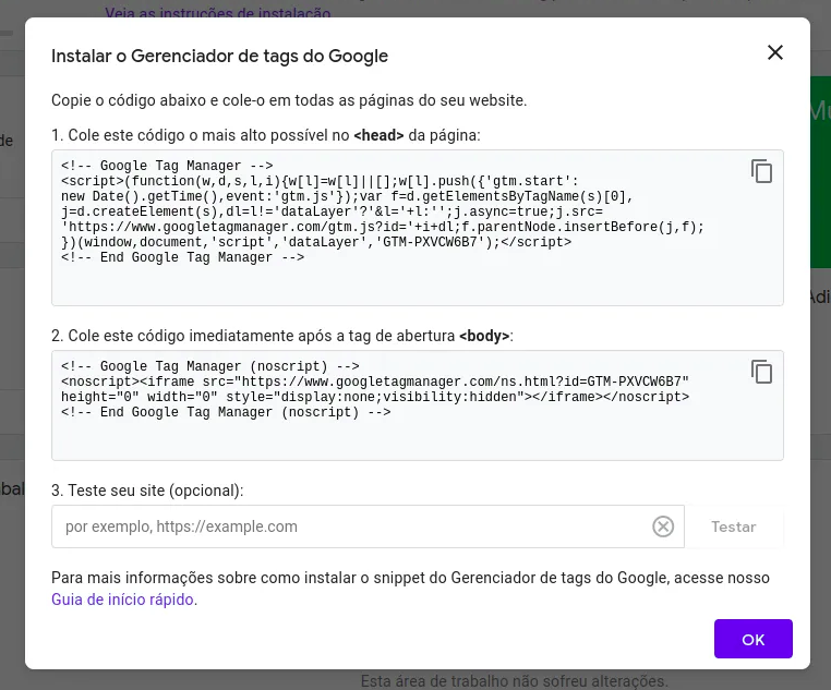 Ao criar sua conta, na sua tela incial já aparecerão os códigos das tags para serem instalados