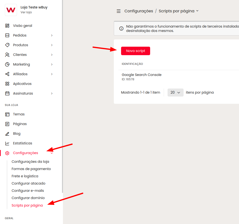 No painel wBuy, em Configurações > Scripts por páginas, clique em "Novo script"