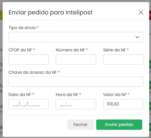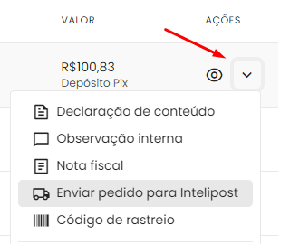 Envio individual: Acesse Pedidos > Listagem em seu painel de controle, encontre o pedido que deseja enviar para Intelipost e no menu de ações clique em Enviar pedido para Intelipost.