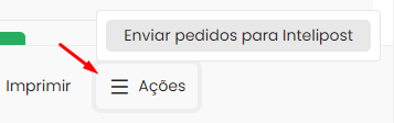 Envio em massa: Acesse Pedidos > Listagem em seu painel de controle, marque os pedidos que deseja enviar para Intelipost, clique em Ações na parte inferior da tela e escolha a opção Enviar pedidos para Intelipost.