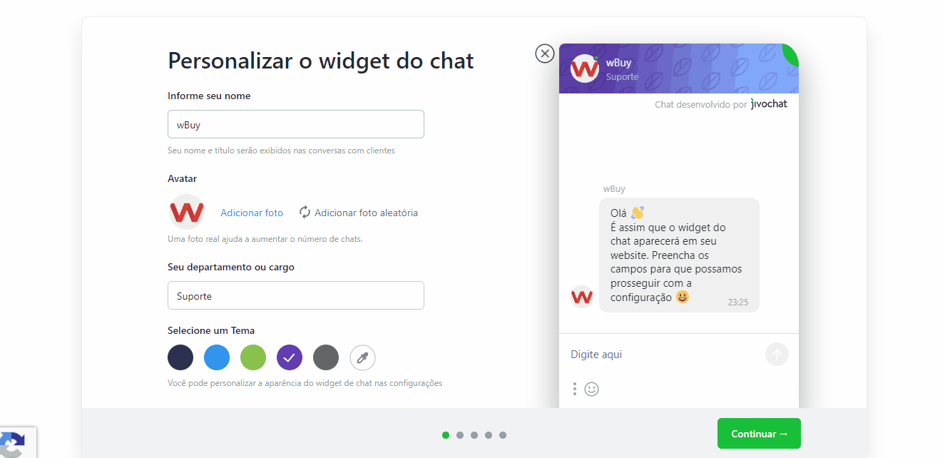 Caso deseje alterar cores, local de amostragem, entre outros pontos visuais do seu chat, pode o fazer em Configurações > Canais > Configurações > Design