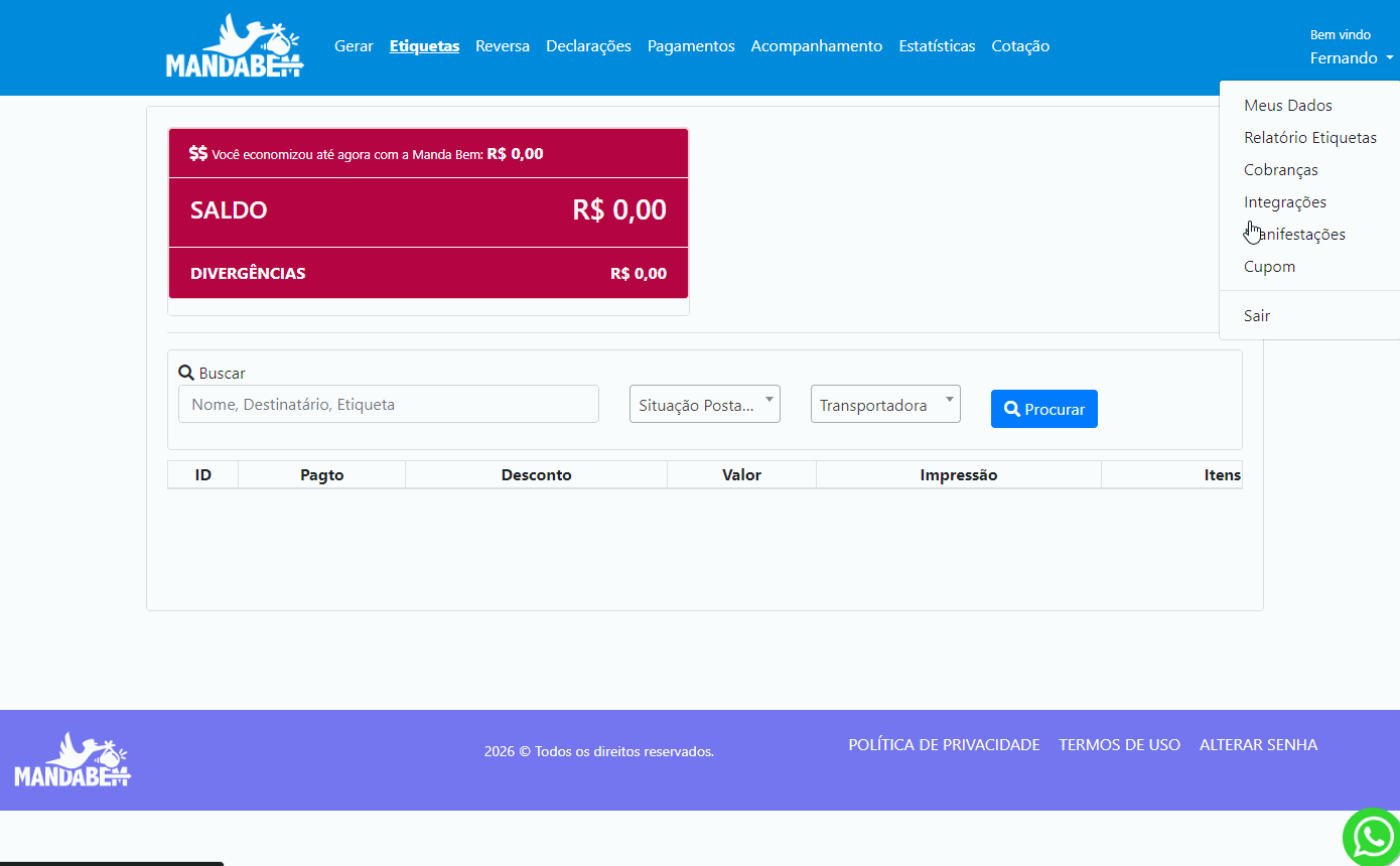 Feito isso o pedido será adicionado ao seu painel da Manda Bem e integrado na wBuy (consulte se a sessão de status de pedido mais abaixo para detalhes).