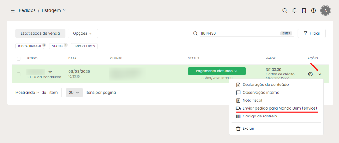 Acesse Pedidos > Listagem e vá nas opções do pedido (seta para baixo) e clique na opção Enviar pedido para Manda Bem (envios):