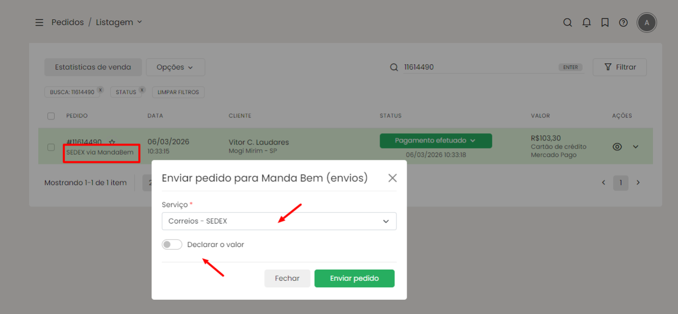Para enviar um pedido à Manda Bem é necessário que o mesmo esteja com o status de "Pagamento efetuado".