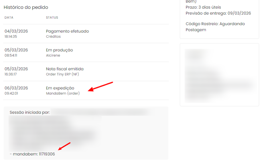 A atualização automática de status somente ocorrerá quando o pedido estiver integrado à Manda Bem, ou seja, quando ele for efetivamente enviado para a plataforma da Manda Bem.