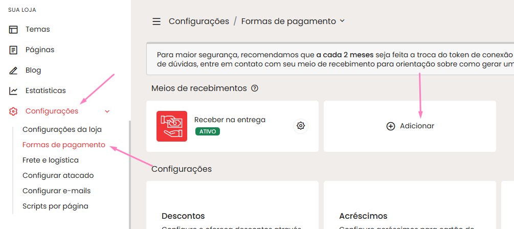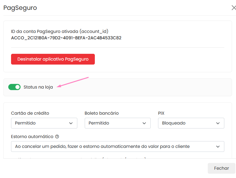 - Configurar as permissões de pagamento e ativar o status na loja