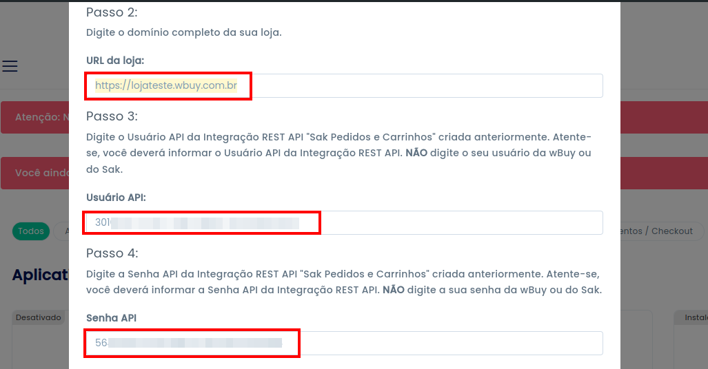 Nos campos Usuário API e Senha API, cole os dados que você copiou no Passo 1.