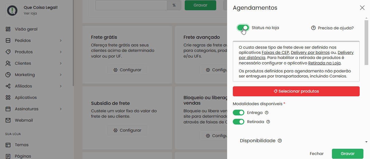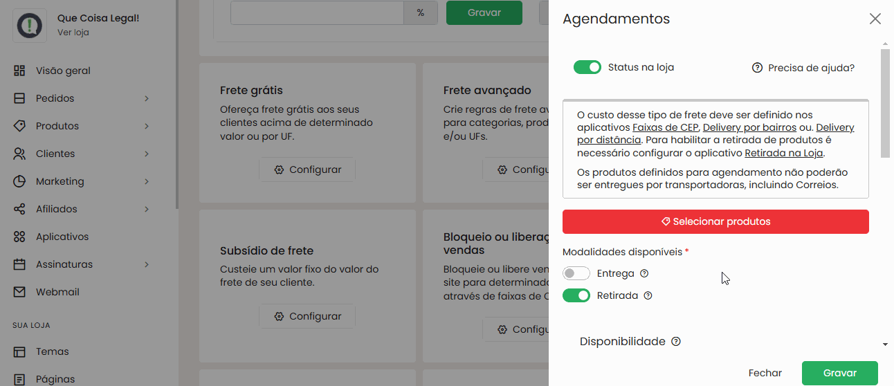 IMPORTANTE: Certifique-se de configurar os custos de frete nos aplicativos mencionados. Para habilitar a opção de retirada, configure o aplicativo Retirada na Loja. - Disponibilidade: Defina os dias e horários específicos da semana para agendamento. Caso deseje deixar o dia sempre habilitado, mantenha o campo vazio.