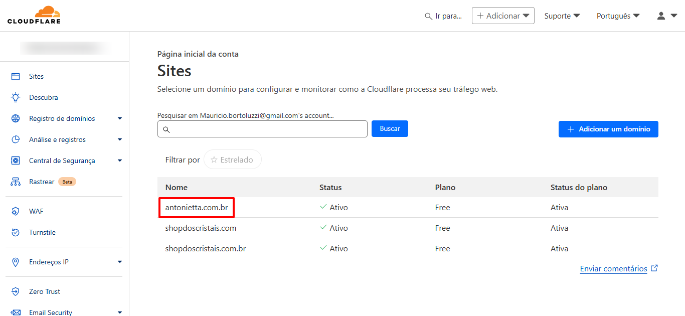 Acessando o Cloudflare e localizando o domínio