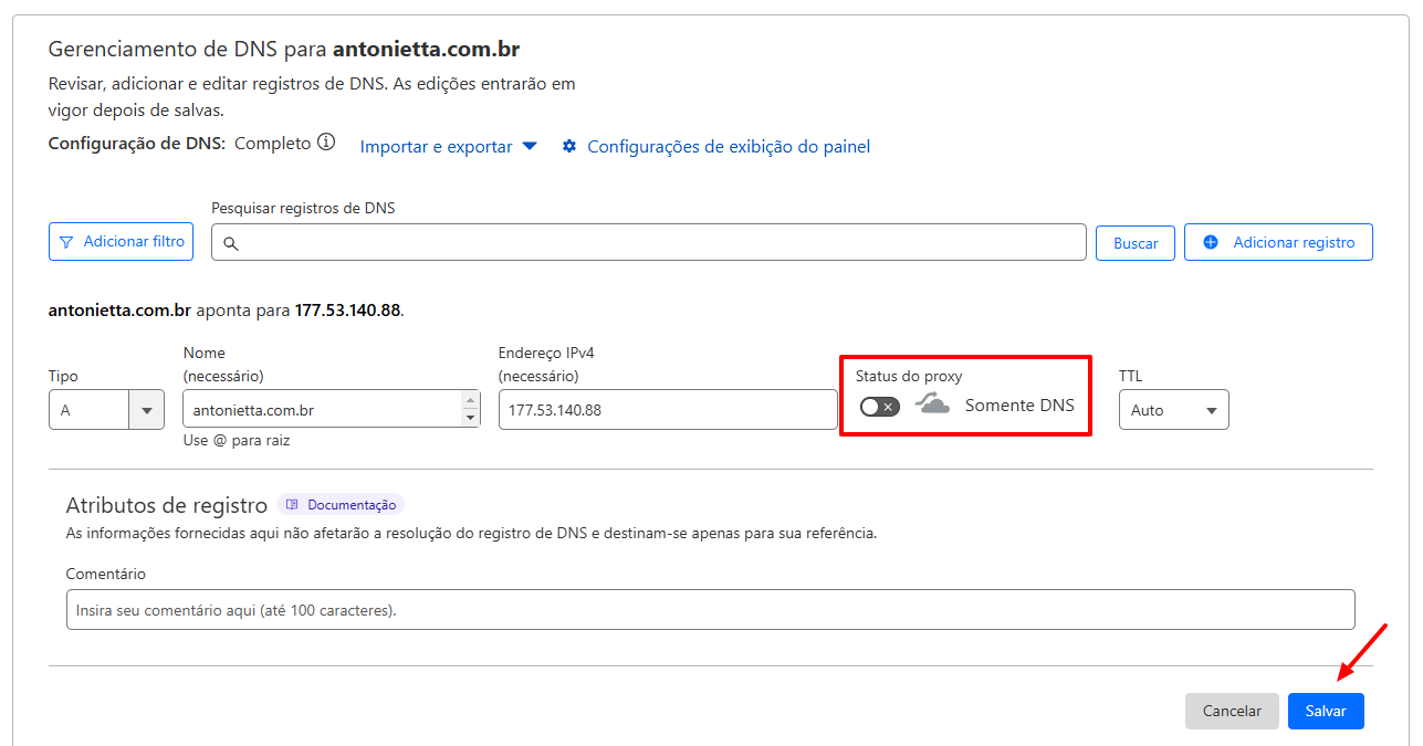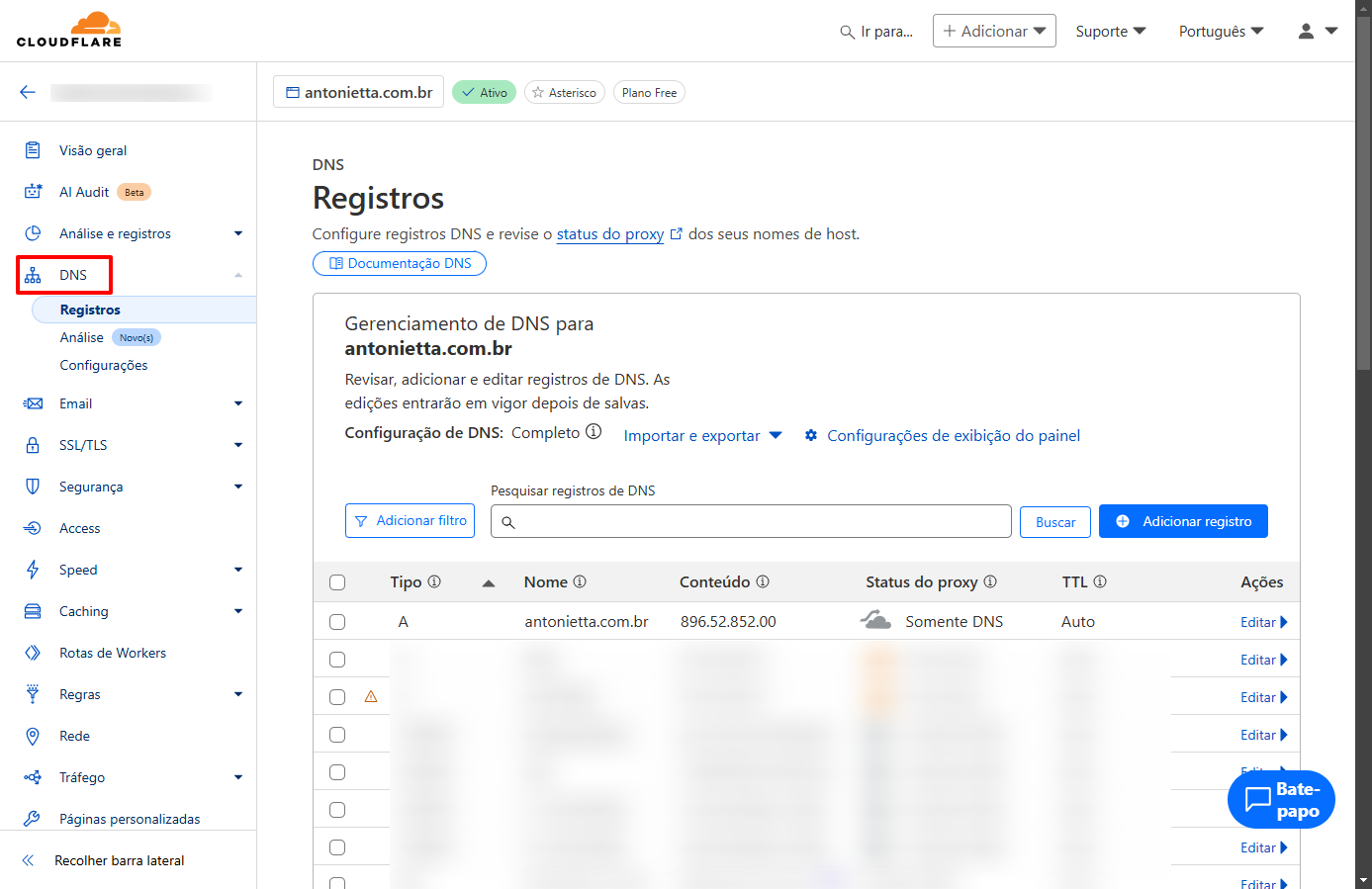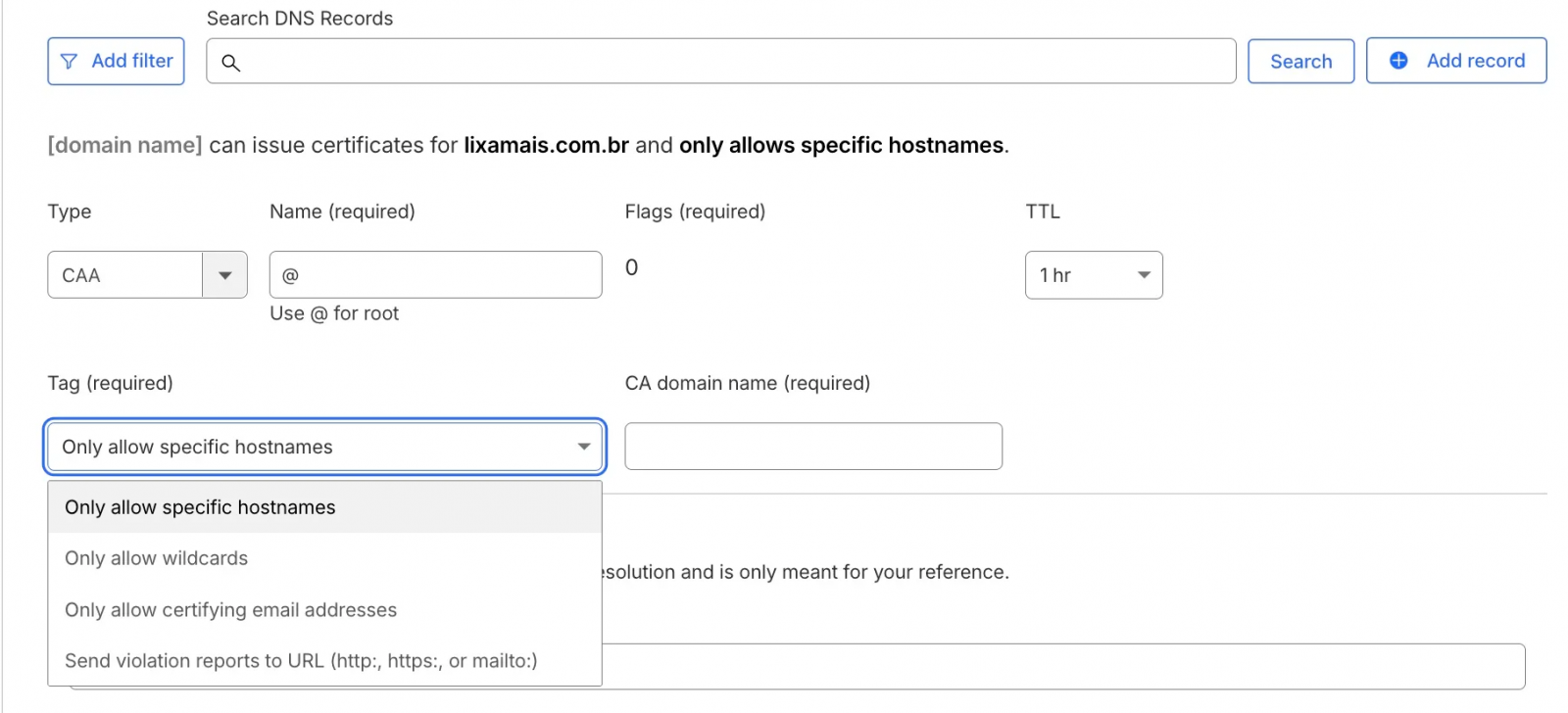 Atenção: Verifique se existe nos apontamentos já criados no Cloudflare do tipo CAA se sim você terá que fazer todos os apontamentos que estão no painel logo abaixo dos principais já adicionados