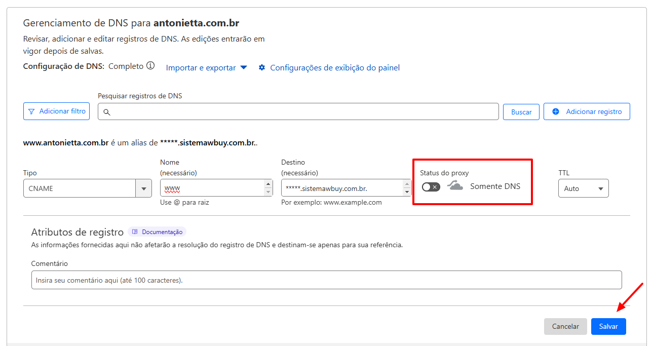 Repita o processo para adicionar os dois apontamentos do tipo CNAME fornecidos pelo painel da wBuy:
