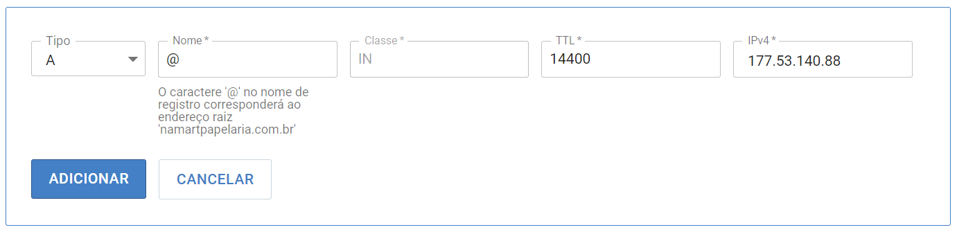 No formulário de adição de Zona DNS, selecione o tipo de entrada (A), preencha o campo Nome com um arroba (@) e o campo IPv4 com a informação 177.53.140.88 conforme imagem a seguir. Ao preencher, clique no botão Adicionar.