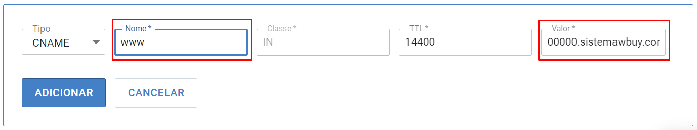 Preencha o campo Nome com as letras www e o campo Valor com a informação disponível no painel wBuy. Depois disso clique em Adicionar.