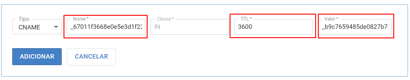 Selecione o tipo de entrada CNAME, preencha o campo Nome com o texto do campo Nome encontrado em seu painel de controle wBuy, o campo TTL com 3600 e o campo Valor com a informação que você também consegue em seu painel de controle wBuy, no campo Valor. Ao preencher, clique no botão "Adicionar".