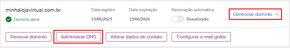Na nova tela localize seu domínio e então clique no botão Gerenciar domínio e então em Administrar DNS.