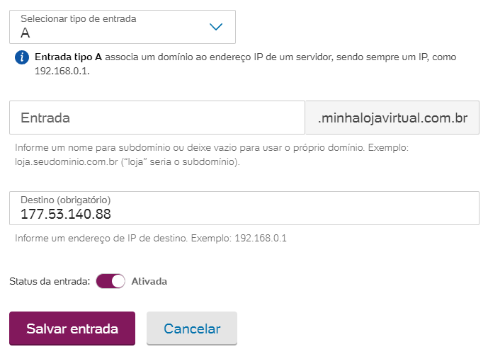 Preencha o campo "Entrada" com as letras www e o campo Destino com a informação disponível no painel wBuy. Depois disso clique em Salvar entrada. Repita o procedimento para criação de uma nova entrada na sequência.