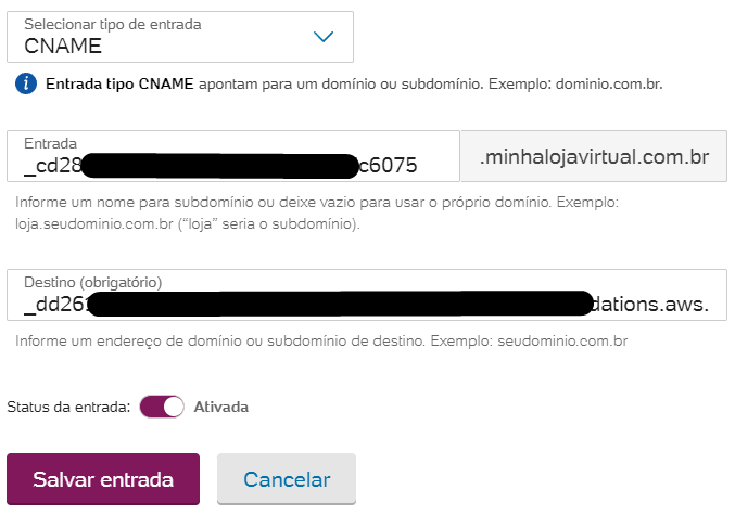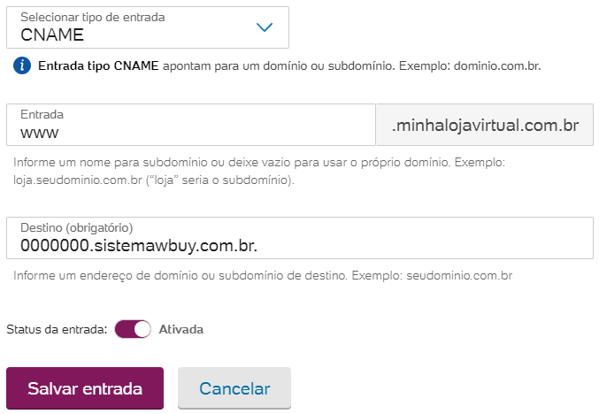 Selecione o tipo de entrada CNAME, preencha o campo Entrada com o texto do campo Nome encontrado em seu painel de controle wBuy e o campo Destino com a informação que você também consegue em seu painel de controle wBuy, no campo Valor. Ao preencher, clique no botão "Salvar entrada".