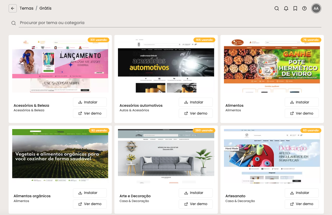 Você poderá clicar no botão Ver demo para acessar uma loja de demonstração e visualizar o tema aplicado na prática ou, se já tiver se decidido, clicar em Instalar tema.