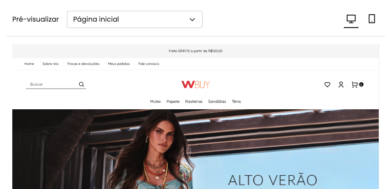 No lado direito você tem uma prévia em tempo real para acompanhar como sua loja está ficando antes de salvar as alterações.