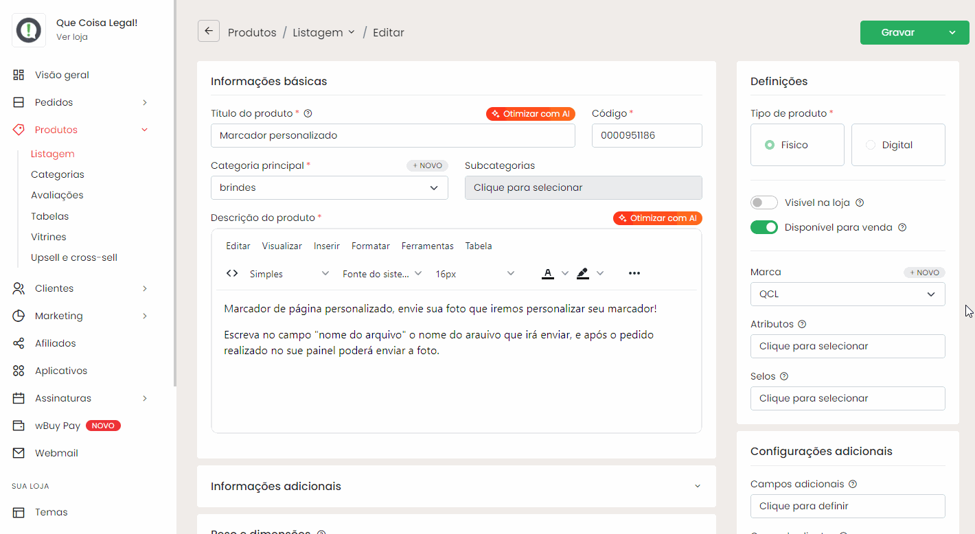 No painel da wBuy, acesse: Produtos > Listagem > Novo Na tela de cadastro, preencha normalmente todas as informações do produto (Nome, Código, Categoria, Descrição, Peso e dimensões, Fotos e