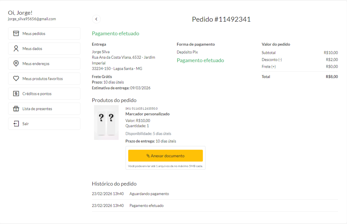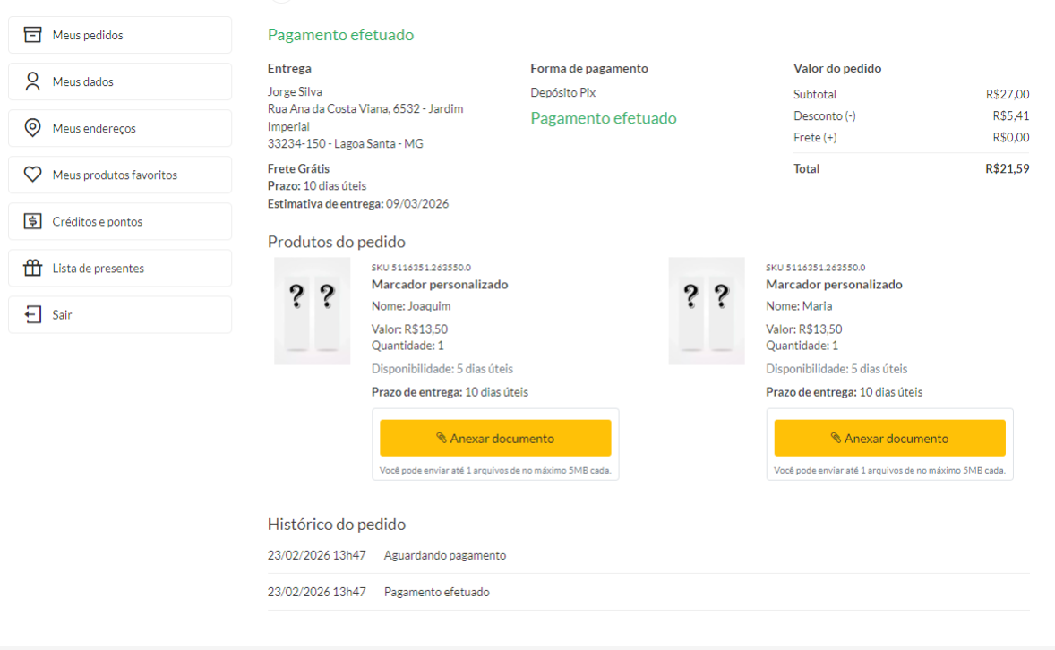 Isso garante tempo suficiente para produzir e personalizar o item, e esses dias serão somados automaticamente ao prazo de entrega, oferecendo ao cliente uma previsão mais realista. - Upload de arquivo