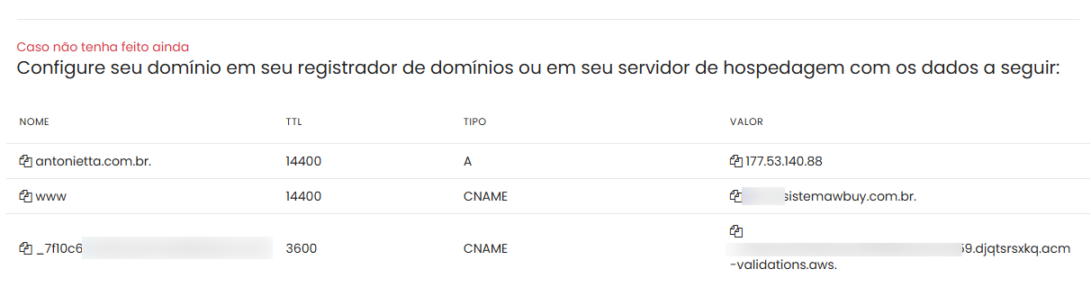 Após verificar que a entrada do tipo A está configurada corretamente, é necessário validar também as duas entradas do tipo CNAME. Essas entradas garantem tanto o apontamento correto quanto o certificado digital de segurança da sua loja.
