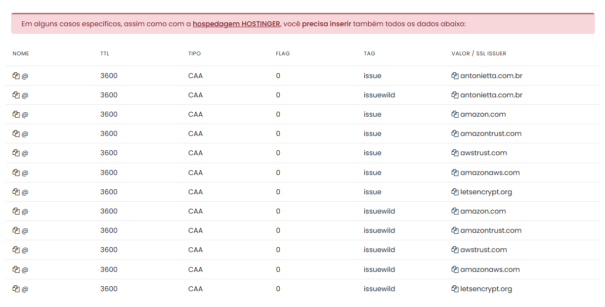 Caso você utilize uma hospedagem como a da Hostinger (ou que tenha entrada do tipo CAA), poderá ser necessário adicionar entradas adicionais, conforme mostrado no exemplo: