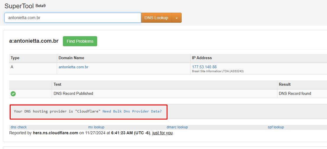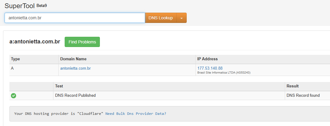 Se você utiliza o Cloudflare, certifique-se de desabilitar a opção de "proxy". No MXToolbox, ao consultar a entrada do tipo A, será exibido um aviso indicando o uso do proxy.
