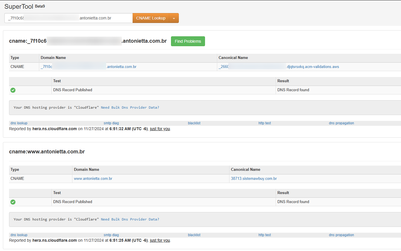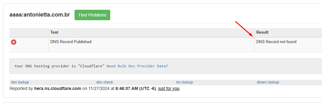 O tipo AAAA aponta para endereços IPv6. Caso existam apontamentos do tipo AAAA configurados para sua loja, podem ocorrer conflitos. Para validar, use a opção AAAA Lookup no MXToolbox. O esperado é que não haja entradas AAAA configuradas.