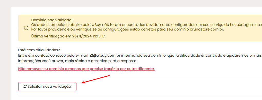 - Se tudo estiver correto, mas a mensagem de validação persistir, clique em Solicitar Nova Validação no painel da wBuy e aguarde até 72 horas para a propagação final.