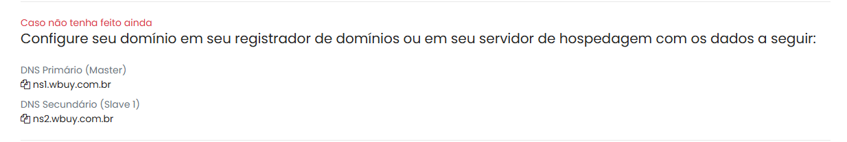 Após configurar o domínio na plataforma, é fundamental ajustar as configurações no seu painel de hospedagem o quanto antes. Isso permitirá que nossos servidores validem os apontamentos ou o DNS configurado. Caso alguma configuração esteja incorreta, será exibida uma mensagem no seu painel da wBuy indicando o problema.