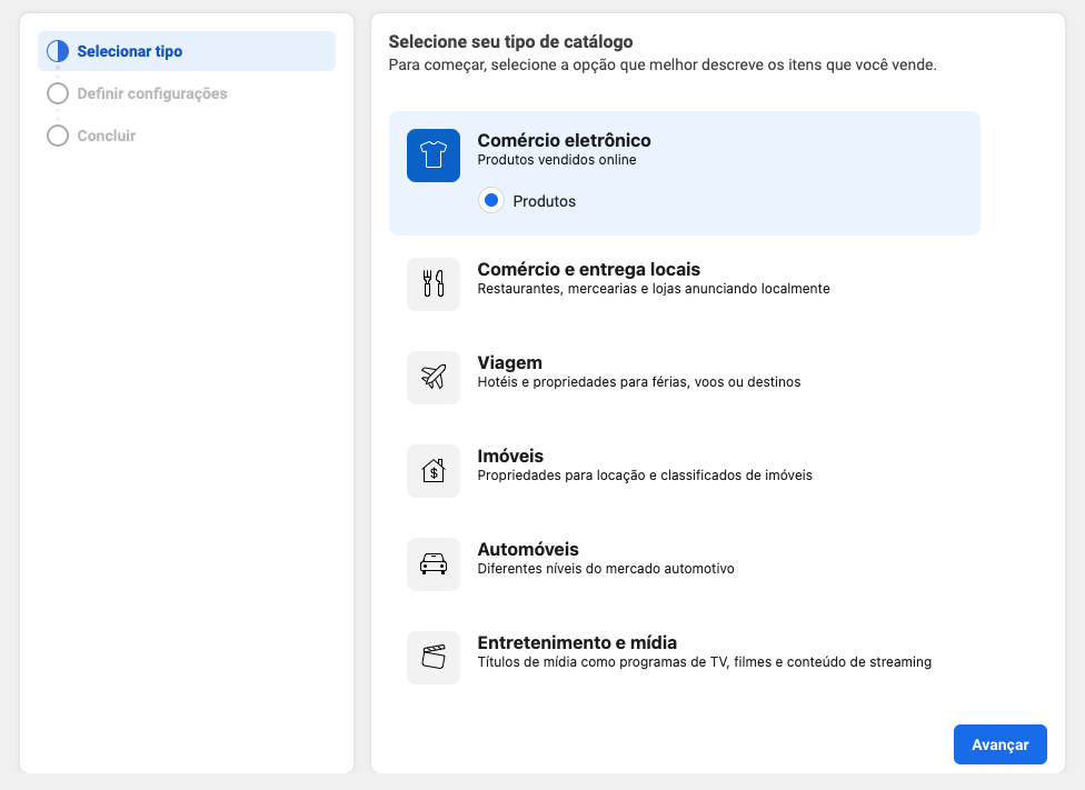 Na nova janela escolha o tipo "Comércio eletrônico" e clique em Avançar.