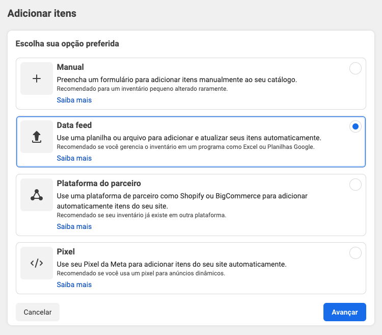 Selecione a opção "Data feed" e clique em Avançar.