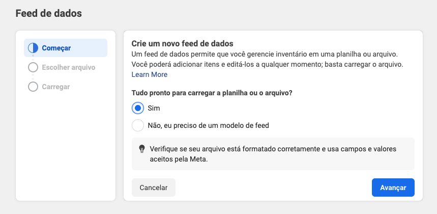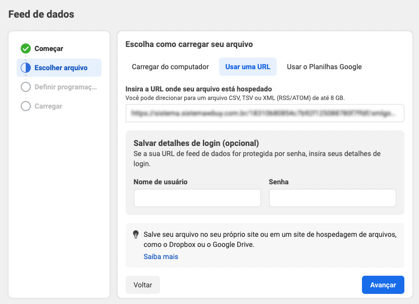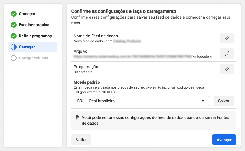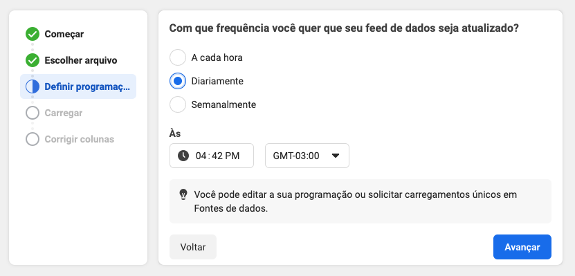 Selecione a frequência que considerar melhor para que a Meta atualize seu feed de dados automaticamente à partir do XML e clique em Avançar.