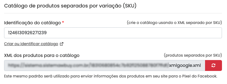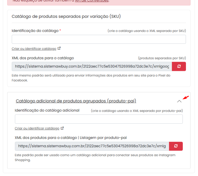 Observação: Cole esse código apenas na Identificação do catálogo principal, não utilize o campo de Identificação do catalogo adicional a menos que tenha mais de um catalogo ( mesmo que use o xml separado por produto pai