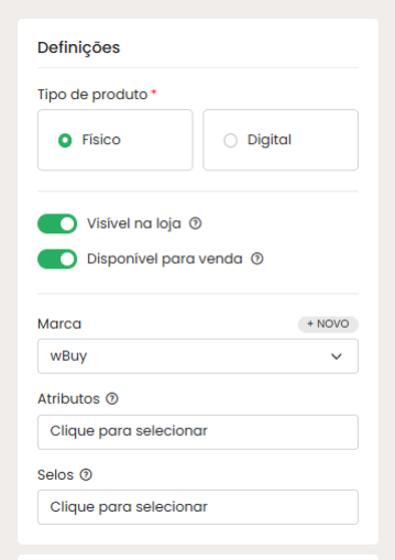 - Visibilidade: As chaves Visível na loja e Disponível para venda devem estar ativas (verdes). Se o produto não estiver disponível para venda, a Meta o considera "Esgotado" e ele é reprovado nos anúncios.
