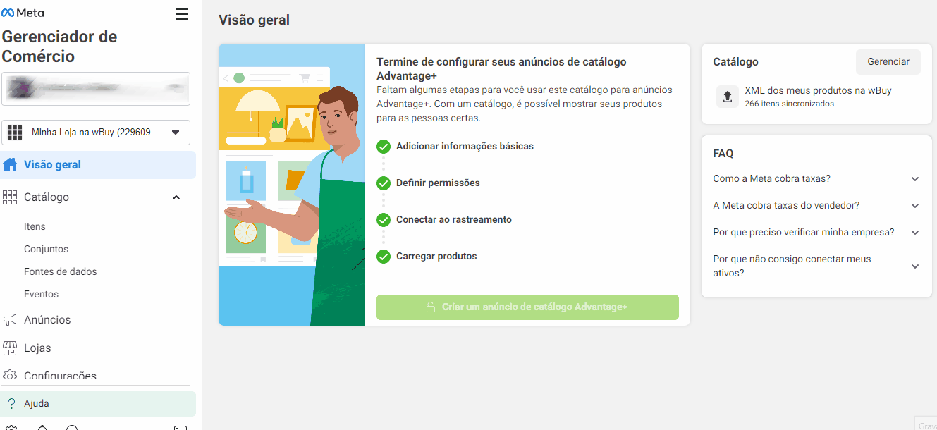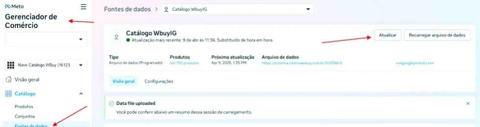 Em seguida, vá até o seu Gerenciador de Comércio da Meta, acesse a aba Fontes de Dados, selecione o catálogo da wBuy e clique no botão Atualizar. Isso forçará a Meta a puxar imediatamente as correções que você fez na sua loja.