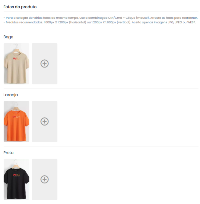 - Fotos por variação: Você deve subir as fotos correspondentes para cada cor ou modelo criado nas abas específicas. Por exemplo: se você criar a variação "Dourado" e "Prata", mas colocar fotos apenas no "Dourado", a Meta bloqueará a variação prata acusando "Imagem ausente". Caso não possua imagnes para todas variações, recomenda-se utilizar o XML do Catálogo adicional de produtos agrupados ( produto-pai ) citado na etapa posteriormente nesse manual.