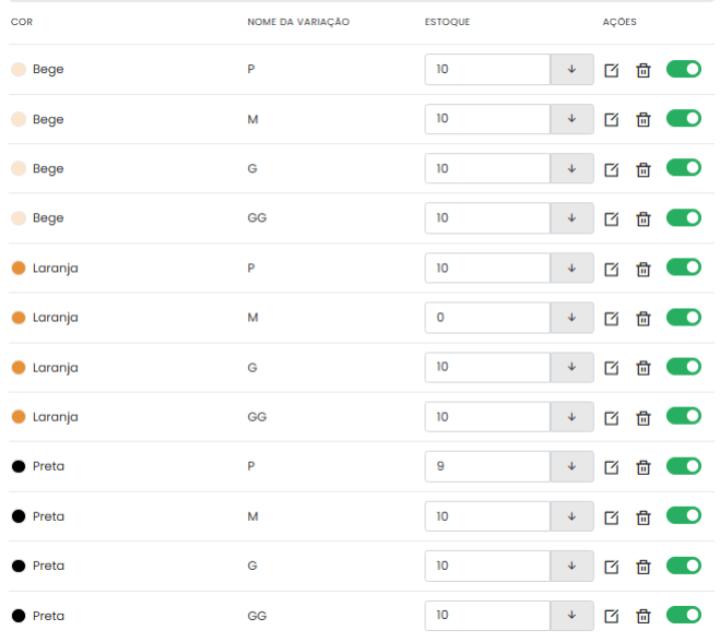 - Estoque: Você precisa informar a quantidade em estoque para cada variação criada, garantindo que a chave de ativação ao lado delas esteja verde.