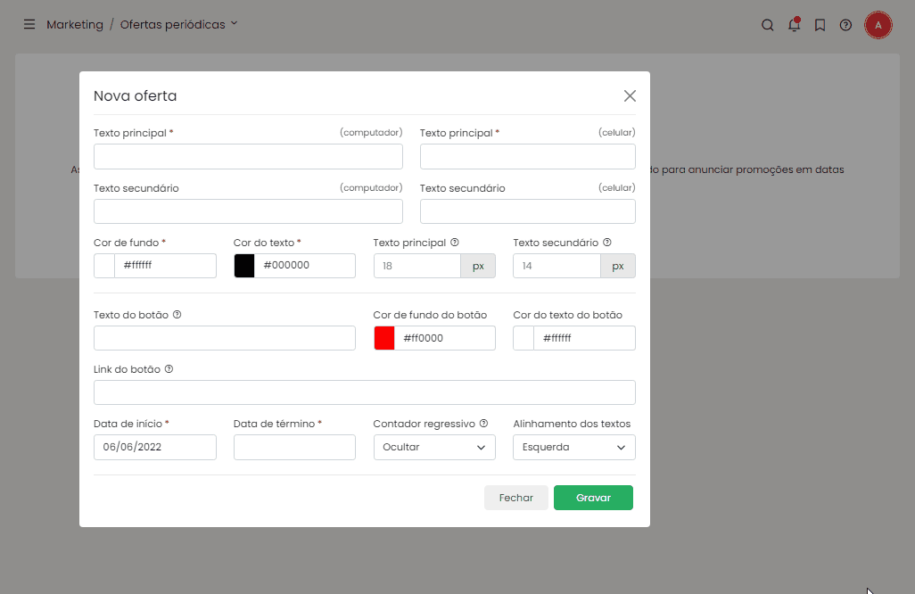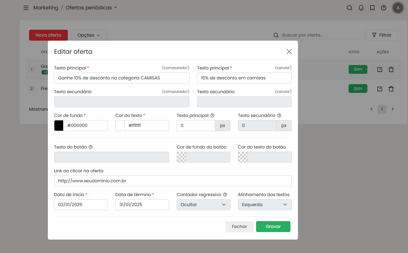 Na sequência vamos definir o período em que a oferta será exibida em sua loja virtual e as cores do texto e de fundo do elemento.