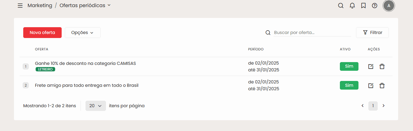 Para começar vamos acessar Marketing > Ofertas períodicas no painel wBuy e clicar em Nova oferta.