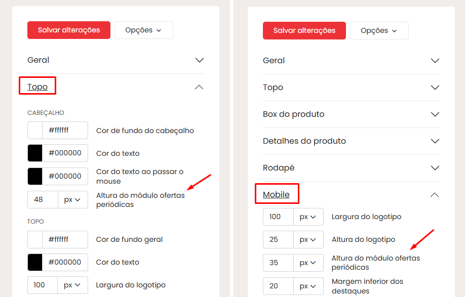 - Ajuste a opção Altura do Módulo Ofertas Periódicas para garantir uma visualização ideal em dispositivos móveis.