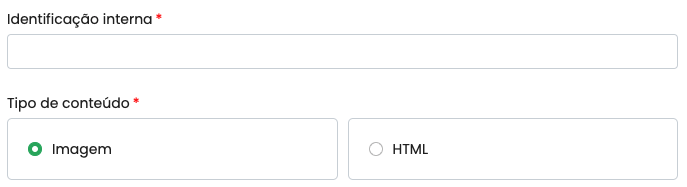 Depois vamos definir uma identificação interna (não será mostrada para seu visitante, é apenas uma referência interna para você identificar na listagem qual popup é esse) e qual o tipo de conteúdo: Imagem ou HTML.