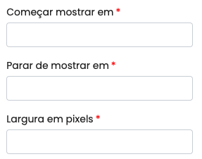 Ao criar um popup de entrada você precisará definir o período em que o popup será exibido e sua largura em pixels.