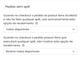 Você também pode configurar qual opção de pagamento será utilizada (exclusivamente) quando o pedido não tiver split, ou seja, quando todos os itens do pedido estiverem na matriz, e não haver split.