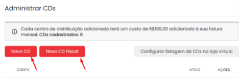Essa é a seção onde você poderá criar e gerenciar seus centros de distribuição. Ao criar um novo CD você poderá escolher entre um novo CD normal, e um novo CD fiscal (CD que utilizará dados fiscais da Matriz, como endereço, dados cadastrais e estoque). E têm um custo adicional de R$199,00 por CD.
