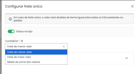 Caso ativado em sua loja, fará com que o valor do frete seja dividido igualmente entre os CDs existentes no pedido. Caso fique inativo, irá calcular o frete de cada CD para o destino do cliente e somará os valores